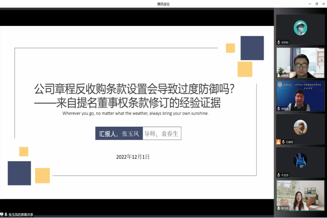 在工作论文交流环节,首先由博士生张玉凤分享工作论文《公司章程反收购条款设置会导致过度防御吗?——来自提名董事权条款的经验证据》。上官泽明老师指出:变量的设置(反收购条款)存在问题,没有排除其他条款的影响;引言中的表述不是特别准确;变量的衡量(x4)存在疑问;研究贡献存在不准确的表达;效率与全要素生产率是不同的概念,文中对此没有进行严格的区分;没有研究作用机制;异质性分析中存在交叉的情况(如监管和问询);建议多学习专门介绍新概念的期刊如《财会学习》。薛海燕老师指出:假设2中的提法存在疑问;假设3的提出过程中逻辑不够清晰;题目和内容联系不够紧密(“过度防御”到底是被解释变量还是交乘项);变量的衡量如“被并购概率”、“提名董事权条款”、“不当设置”等存在争议。周愈博老师指出:“过度防御”这个概念没有参考依据,论证需要更加充分;被收购的样本达到47%,这与常理不符;假设2和假设3的设置存在问题。续慧泓老师补充:“过度防御”到底是一种行为还是一种态度,目前文中的表述不够清楚。