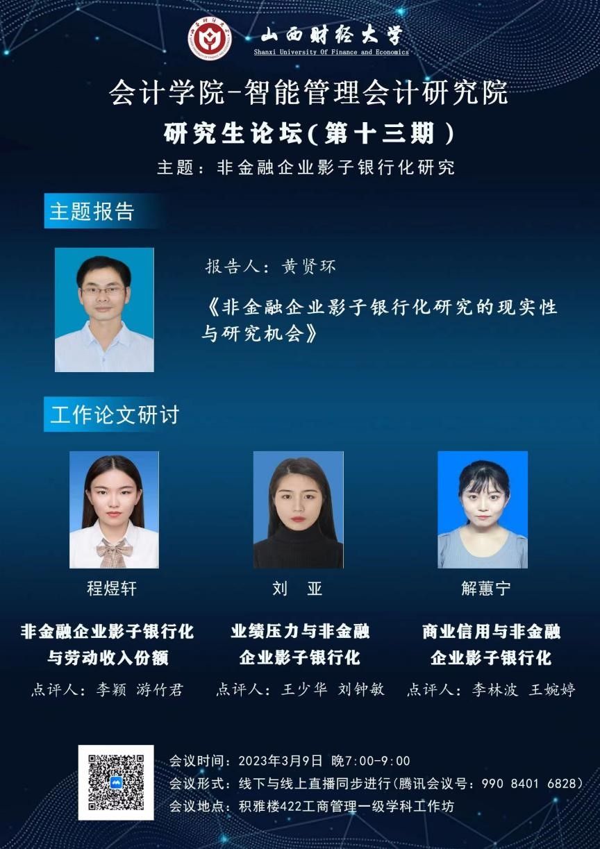 与智能管理会计研究院联合举办的研究生论坛(第十三期)以线下及线上两种形式同步举行。本次学术论坛的主题为“非金融企业影子银行化”。本期论坛的轮值主持人为黄贤环副教授。