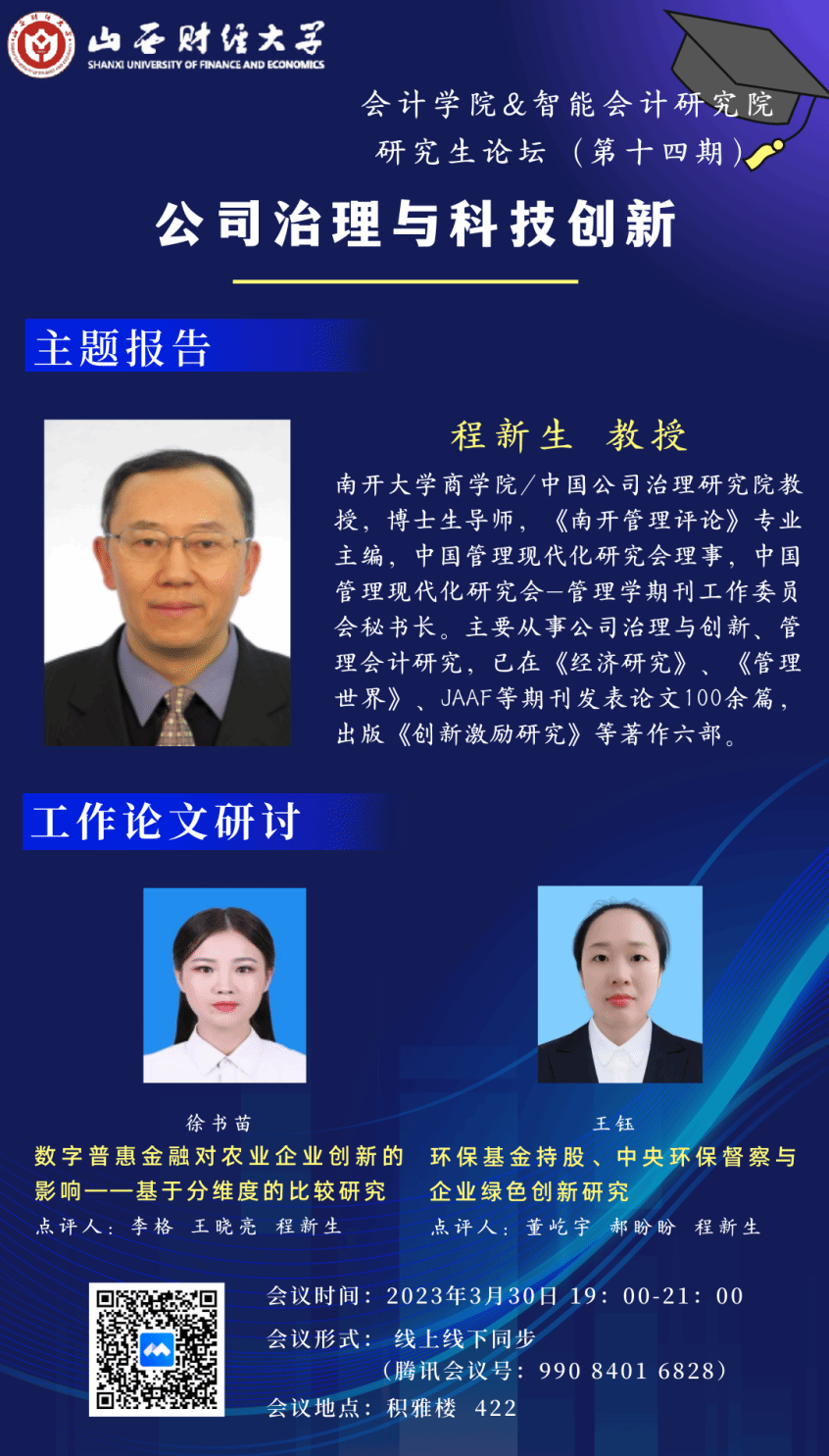 与智能管理会计研究院联合举办的研究生论坛(第十四期)以线下及线上两种形式同步举行。本次学术论坛的主题为“公司治理与科技创新”,轮值主持人为财务会计教研室主任王晓亮教授。论坛特别邀请南开大学教授程新生做讲座。