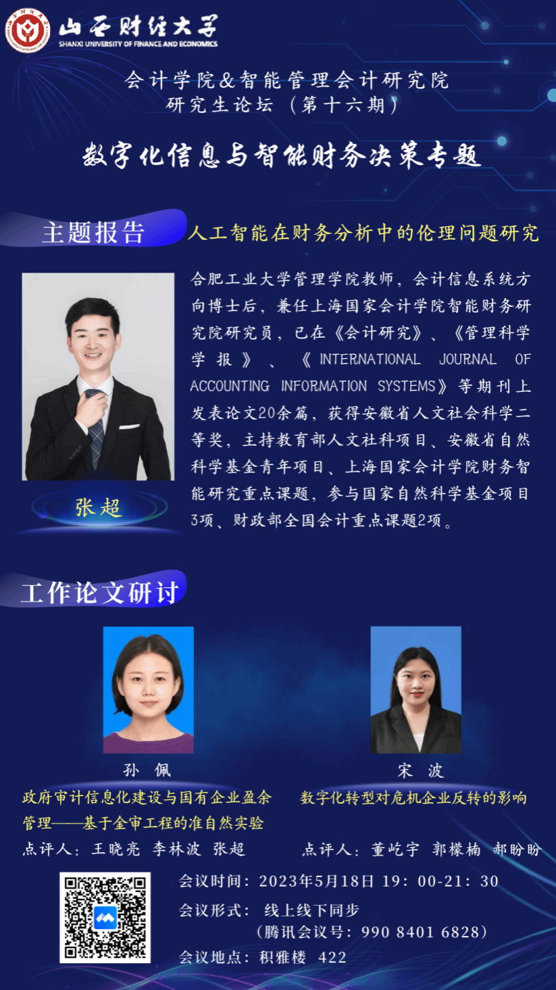 与智能管理会计研究院联合举办了研究生论坛(第十六期)。本次论坛的主题为“数字化信息与智能财务决策”,采取线下与线上同步的方式。轮值主持人为污污漫画