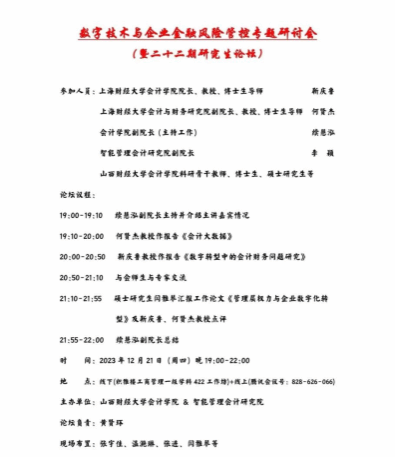 与智能管理会计研究院联合举办的研究生论坛(第二十二期)以线下和线上两种方式同步进行。本次学术论坛的主题为“数字技术与企业金融风险管控”,主持人为污污漫画