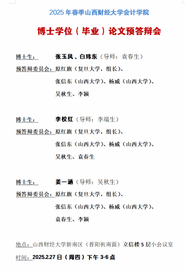 召开2025年上半年博士研究生学位论文预答辩会。预答辩委员会由复旦大学原红旗教授、山西大学张信东教授和杨威教授、山西财经大学吴秋生教授、袁春生教授和李颖教授组成,原红旗教授担任预答辩委员会主席。张玉凤、白玮东、李校红和姜一涵四位博士生进行现场答辩。