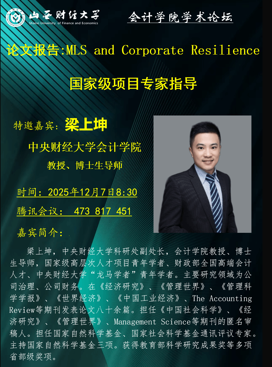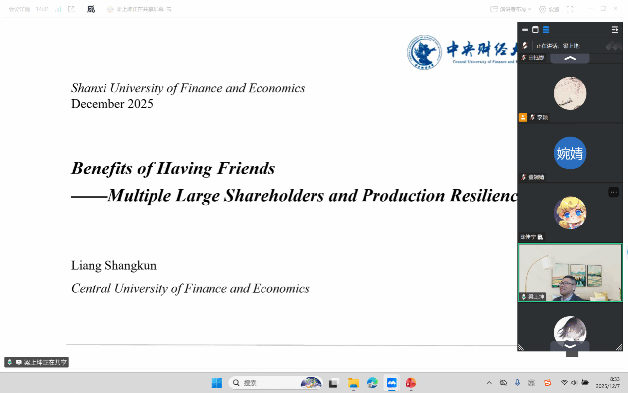 在第一场报告中,梁上坤教授介绍了工作论文《Benefits of having friends:Multiple large shareholders and corporate resilience》。借助公共卫生事件对公司经营带来风险这一冲击事件,研究发现与拥有单一大股东(SLS)的公司相比,拥有多个大股东(MLS)的公司对公共卫生事件表现出更强的抵御风险韧性。与会师生积极热烈地同梁教授展开研讨和交流,丰富了师生们对多个大股东领域的认识,为公司治理研究提供了新的思路和见解。